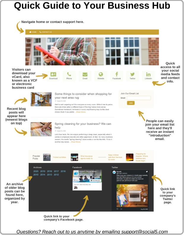 Q. In the Business Hub where it shows buttons to phone, email, Facebook, website, Twitter, and LinkedIn where does that information come from and how is it updated or changed?